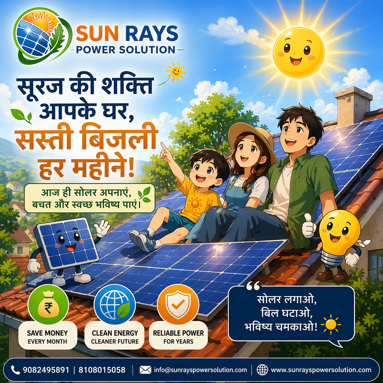 बिजली बिल से छुटकारा पाओ, सोलर अपनाओ, हर महीने बचत बढ़ाओ। 📞 9082495891 | 8108015058 📩 info@sunrayspowersolution.com